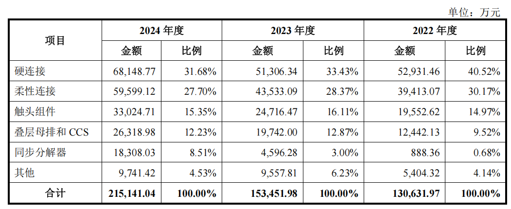 招股书显示,维通利主营业务为硬连接、柔性连接、触头组件、叠层母排和CCS等系列化电连接产品以及同步分解器等产品的研发、生产和销售。公司致力于为全球各领域客户提供高性能电连接产品及贴合其个性化需求的产品组合方案,使电连接更加安全、可靠、绿色、智能。