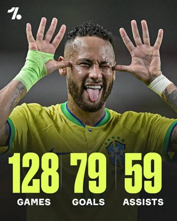 Onefootball更新社媒动态,并晒出了内马尔在巴西国家队的数据,至今各项赛事代表桑巴军团出场128次,打入了79个进球,还有59次助攻,合计参与进球138个,场均参与进球>1个,真是效率奇高。