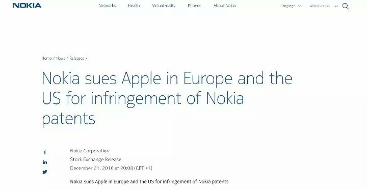 2016年,诺基亚指控苹果违规使用自家的专利,官司拖了两年多,最后苹果不仅赔了一大笔钱,以后每卖一台iPhone,还得给诺基亚上交授权费。