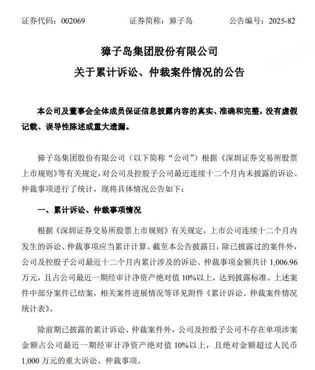 诉讼纠纷方面,獐子岛12月29日晚还公告称,截至公告披露日,除已披露过的案件外,公司及控股子公司最近12个月内累计涉及的诉讼、仲裁事项金额共计1006.96万元,且占公司最近一期经审计净资产绝对值10%以上,达到披露标准。