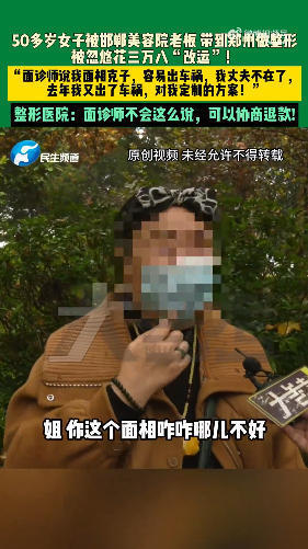 近日,河北邯郸一名50多岁女子反映,自己被当地美容院老板带至郑州一家整形医院,面诊师称其“面相克子、易出车祸”,她联想到丈夫去世、自身经历车祸等遭遇,被说中“心坎”,支付3.8万元做整形“改运”。
